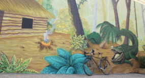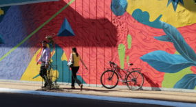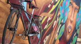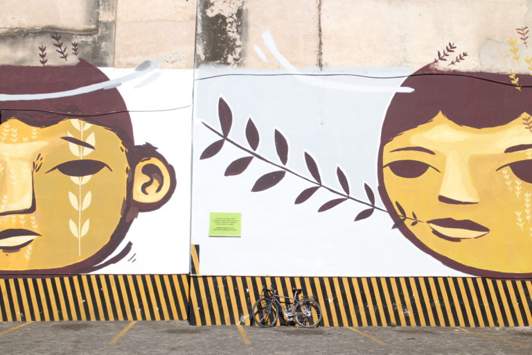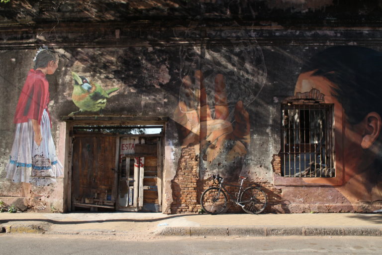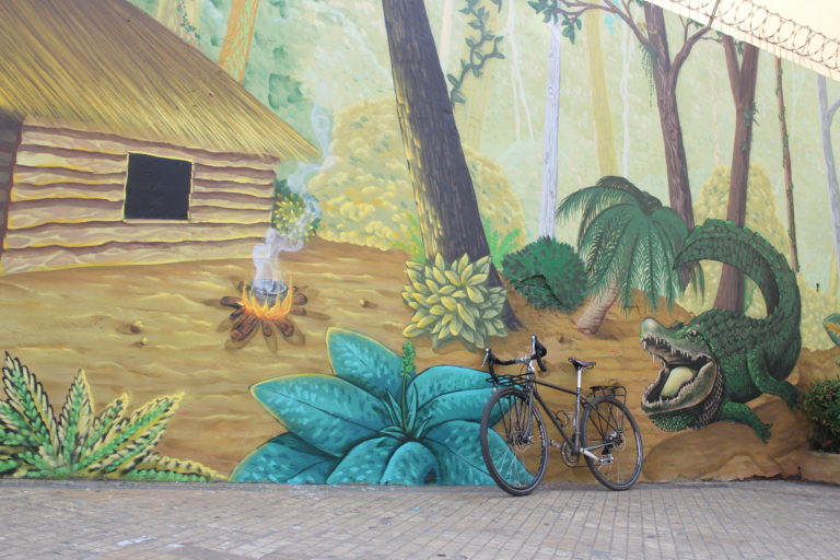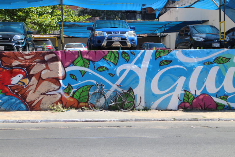 The pieces of LatidoAmericano are all located in the historic center of Asunción, and as the distances are relatively small, it’s completely feasible to see them all on foot. I personally love rambling the street of Asunción on a bicycle. So, if you can get access to one, I advice you to do the same. Just keep in mind that cars are not too used to seeing cyclists on the roads and, therefore, don’t always remember to watch out for cyclists too attentively. Here are pics of my bicycle in front of some of the street level murals of Asunción. (it’s not a very varying model, but still, I enjoy photographing it.)