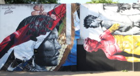 During the the week-long festival, the artists worked passionately on the rediscovery of Paraguay. The end result is amazing: 44 murals in 40 different places, done by 35 artists from 12 different countries. Many different styles and techniques united by the spirit of Latin America and the mystic history of Asunción, turned from a purely aesthetic experience into a playground of past and present. Only one of the murals has been painted over by this date, because the religious owner of the house didn’t approve its supposedly ‘satanic symbolism’. “But that’s how it is”, Oz says, “as a graffiti artist you learn to let go. Sometimes your works are there for only a few weeks and all what’s left of them afterwards is a photo or two for people to look at”. However, right now in Asunción, you don’t have to look at pictures or enter galleries to see the rest of the works. All you have to do is simply open your eyes and look around. And please do it, because this project is like a time machine which lets you enjoy the flow of present Latin American urban art whilst simultaneously rooting you deeper into the ground you’re standing on. So, people, get your asses to Asunción and check it out yourselves! And if you can’t do it, at least check out the pictures and videos below to see the rest of the works and the process involved in creating them.